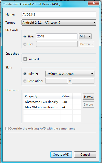 - 点击New按钮,弹出如下窗口,选项填完后点击Create AVD,等待创建成功提示