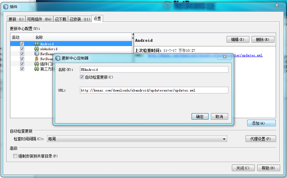 - 点击"添加"按钮,出现如下界面,自己选择名称,将 http://kenai.com/downloads/nbandroid/updatecenter/updates.xml 添加到URL,确定