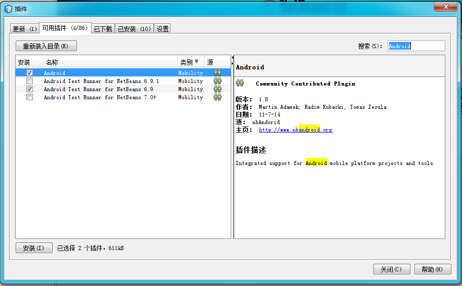 - 切换到可用插件选项卡(Available Plugins),找到Android插件(如下),按照提示安装即可。