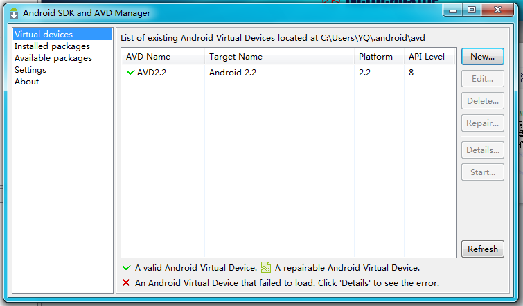 - 打开工具(Tools )-> Android SDK and AVD Manager -> Virtual Devices,稍等片刻,弹出如下界面