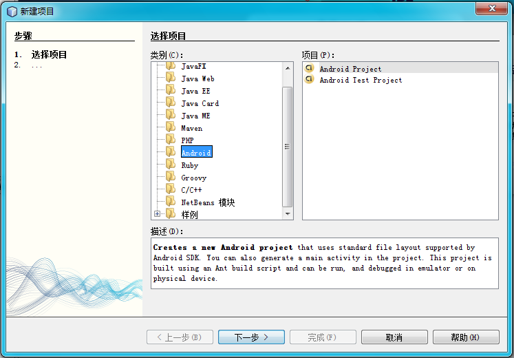 到现在为止,环境配置已经大功告成了,现在就可以在你的NetBeans里创建一个Android项目了,步骤如下: