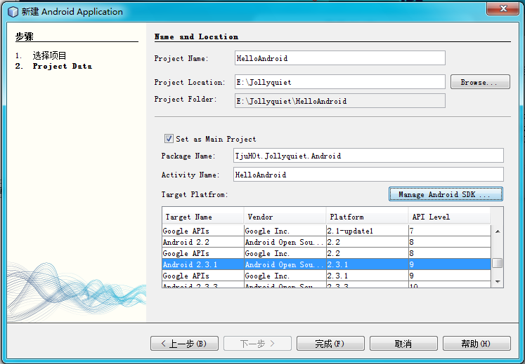 - 填写好项目名称,Package名,Activitiy名,选择好相应的SDK版本,点击完成按钮