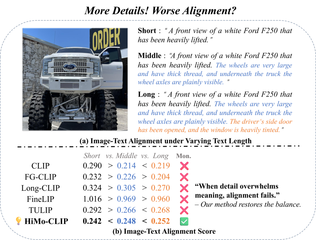 如下图所示,对于同一张“白色福特F250皮卡”的图片,当文本从简短的“正面视图...”扩展到包含“超大轮胎”、“车轴可见”、“有色车窗”等详细描述的长文本时,许多SOTA模型的对齐分数反而下降了!