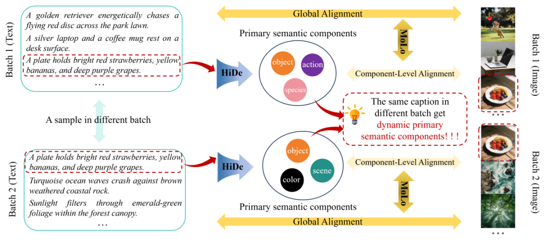 在真实场景中,数据样本往往是高度复杂的。如图2所示,我们面对的不是简单的“红苹果”和“绿苹果”,而是像“一只金毛猎犬在公园草坪上追赶红盘”、“盘子里放着鲜红的草莓、黄香蕉和深紫色的葡萄”这样高度复杂的场景。传统的固定分词法在这种复杂度下根本抓不住重点。HiMo-CLIP换了个思路,它像一个玩“大家来找茬”的高手:通过观察Batch内的“邻居”,动态提取最具区分度的特征。