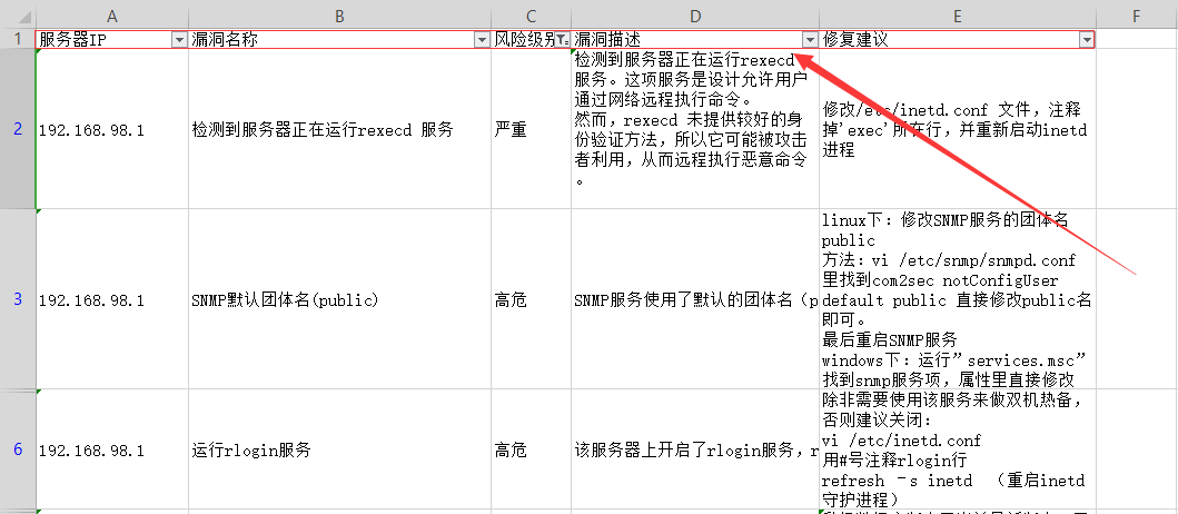 最终,同目录下,生成CSV文件,包含服务器IP、漏洞名称、风险级别、漏洞描述、修复建议。