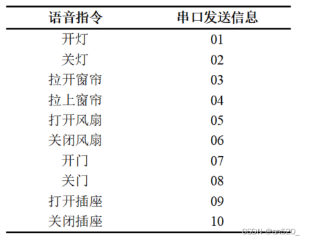第二级识别词用来控制“家居”,如:“开灯”“关灯”“拉开窗帘”“拉上窗帘”等。同时将对应的串口信息发送至stm32.其指令表及发送串口数据如表所示:
