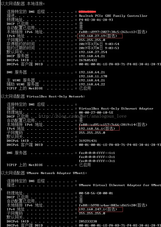 上文中,机器有三个网卡地址,如果使用bind到0.0.0.0上的话,则可以使用192.168.27.19或 192.168.56.1或 192.168.247.1任意地址去connect,如果bind到127.0.0.1,则只能使用127.0.0.1这个地址去connect。