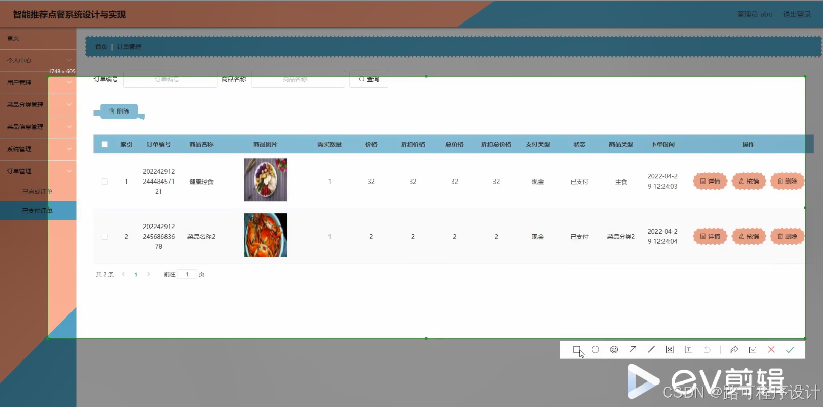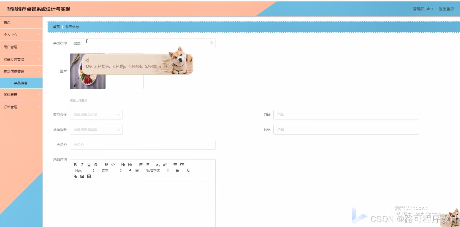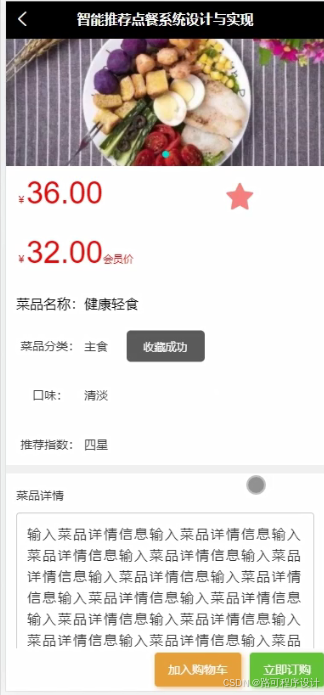 - 系统开发成果:成功开发出一个功能完整的智能推荐点餐系统,包括用户端的点餐界面、商家端的管理界面等,实现用户注册登录、菜品分类展示、菜品信息查询、智能推荐、订单管理等功能。