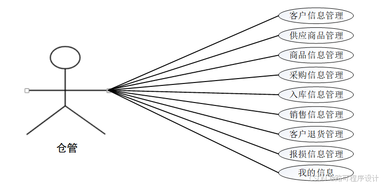 (3)、仓管关键功能包含客户信息管理、供应商品管理、商品信息管理、采购信息管理、入库信息管理、销售信息管理、客户退货管理、报损信息管理、我的信息等进行管理。仓管用例如下: