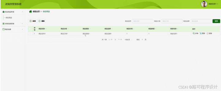供应商点击供应商品管理。在供应商品页面输入商品名称、商品分类和选择商品品牌进行搜索、新增或删除供应商品列表,并根据需要对供应商品详细信息进行详情、更新或删除操作。如图5-11所示: