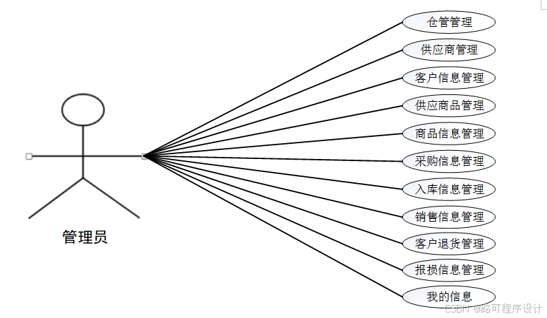 (1)管理员关键功能包含仓管管理、供应商管理、客户信息管理、供应商品管理、商品信息管理、采购信息管理、入库信息管理、销售信息管理、客户退货管理、报损信息管理、我的信息等进行管理。管理员用例如下: