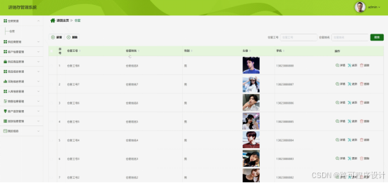 管理员点击仓管管理。在仓管页面输入仓管工号和仓管姓名进行搜索、新增或删除仓管列表,并根据需要对仓管详情信息进行详情、更新或删除操作;如图5-3所示: