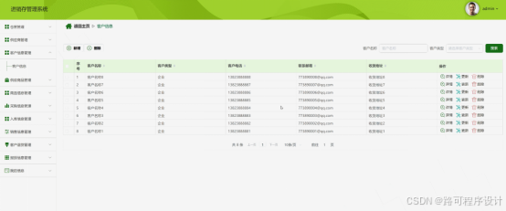 管理员点击客户信息管理。在客户信息页面输入客户名称和选择客户类型进行搜索、新增或删除客户信息列表,并根据需要对客户详情信息进行详情、更新或删除操作;如图5-5所示: