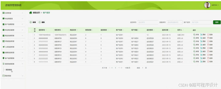 管理员点击客户退货管理。在客户退货页面输入退货单号、销售单号和客户名称进行搜索、新增或删除客户退货列表,并根据需要对客户退货详情信息进行详情、更新或删除操作;如图5-9所示: