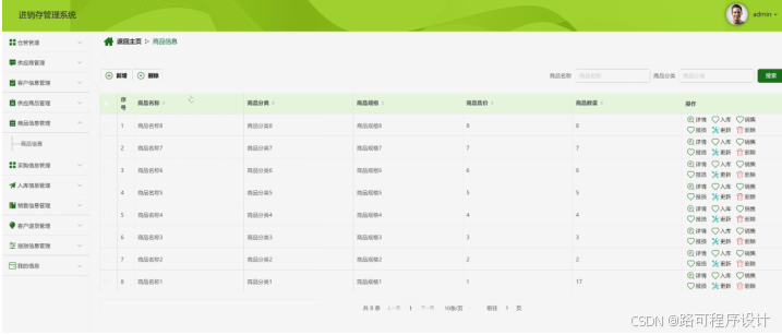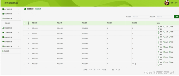管理员点击商品信息管理。在商品信息页面输入商品名称和商品分类进行搜索、新增或删除商品信息列表,并根据需要对商品详情信息进行详情、入库、销售、报损、更新或删除操作;如图5-7所示: