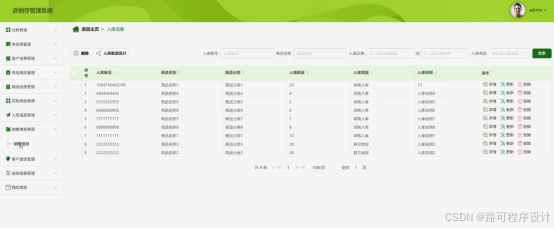 管理员点击入库信息管理。在入库信息页面输入入库编号、商品名称、入库日期起始至结束和选择入库类型进行搜索、入库数量统计或删除入库信息列表,并根据需要对入库详情信息进行详情、更新或删除操作;如图5-8所示: