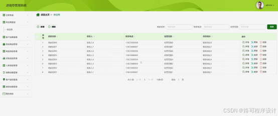 管理员点击供应商管理。在供应商页面输入商家名称、联系电话和经营范围进行搜索、新增或删除供应商列表,并根据需要对供应商详情信息进行详情、更新或删除操作;如图5-4所示: