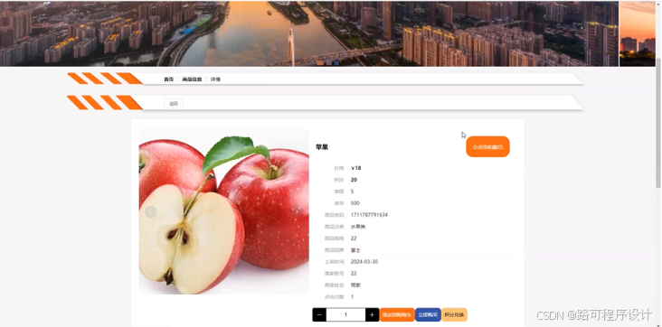 商品信息:在商品信息页面的输入栏中输入商品名称、商品品牌或价格进行查询,可以查看到商品详细信息,并进行添加购物车、立即购买、积分兑换或收藏操作;商品信息页面如图5-3所示: