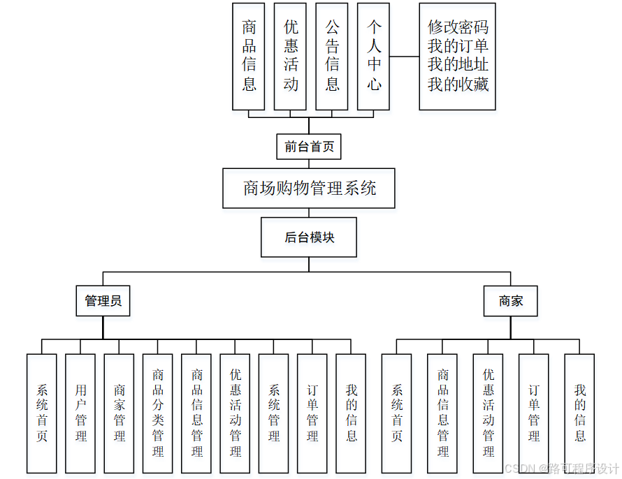 系统的建设可以为商场购物管理提供帮助,通过对一些基础信息管理实现针对性的安排,可以按照用户的角色权限使不同用户角色看到不一样的信息界面。现根据需求阶段的分析,我们可以大致确定系统需要包含的功能如下图所示: