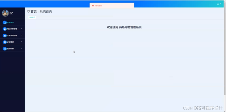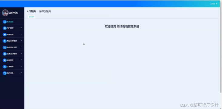 管理员进入主页面,主要功能包括对系统首页、用户管理、商家管理、商品分类管理、商品信息管理、优惠活动管理、系统管理、订单管理、我的信息等进行操作。管理员主页面如图5-7所示: