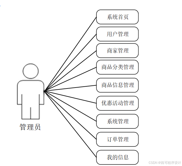 (2)管理员可以对系统首页、用户管理、商家管理、商品分类管理、商品信息管理、优惠活动管理、系统管理、订单管理、我的信息等进行基本的信息管理。其用例分析如图3-2所示。