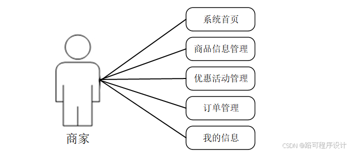 (4) 商家进入系统可以对商品信息管理、优惠活动管理、订单管理、我的信息等功能进行操作,用例分析如图3-4所示。