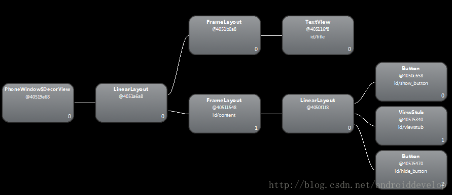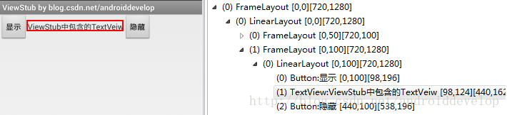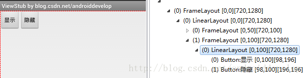 小白:我发现activity_main.xml布局文件在“显示”,“隐藏”两个按钮之间有一个<ViewStub>而在上面的截图中并没有,说明ViewStub在初始化加载时并不会添加到视图树上(Android UI Tree)。我也使用“Hierarchy View”工具的截图如下: