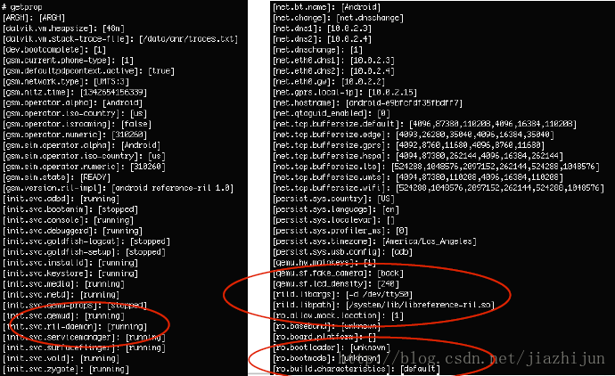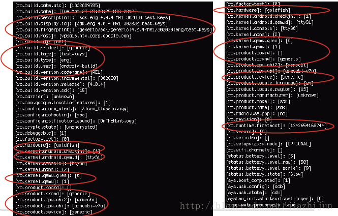 如何检测App运行环境是否为qemu虚拟机呢? 我们可以通过getprop获取相关信息,getprop在qemu虚拟机和移动设备上很多属性是不同的。比如: