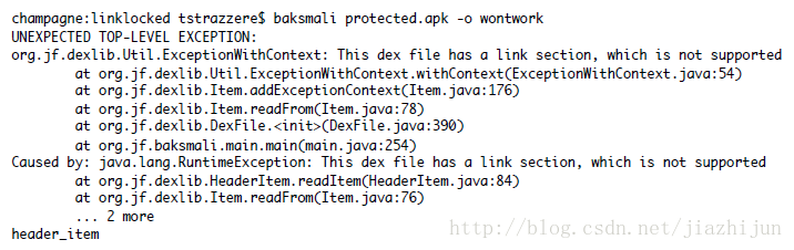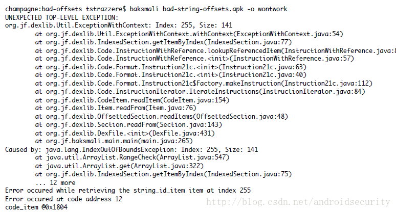 1、构建DEX link section触发baksmali工具崩溃(DEX文件结构请查看http://blog.csdn.net/androidsecurity/article/details/8664778)