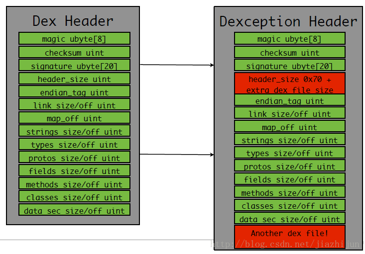 我们可以在Dex文件头隐藏另一个DEX数据并在运行时加载附带DEX数据。