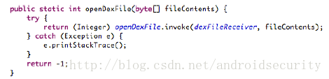 该种方式能够使攻击者“隐藏”敏感API调用。但是这种方式只需要查看是否利用JAVA反射即可很容易的被识破。