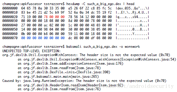 当DEX Header size 不等于0x70时,backsmali也会抛出异常退出!