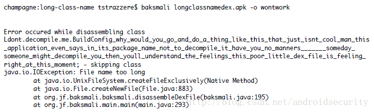 JAR对文件名的长度是没有现在的,但是操作系统要求文件名不能大于255;我们可以通过构建大于255字符的长类名来达到反逆向的目的。