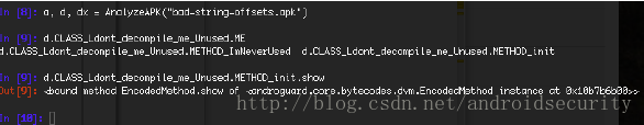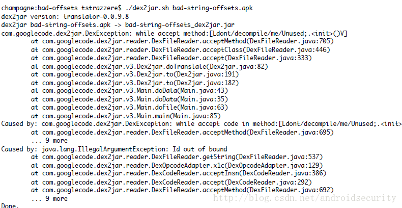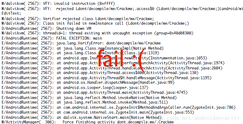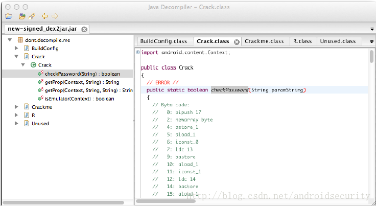 该种方法的缺点是很容易被工具修复。工具在反编译代码时,只要忽略会无效字节码的处理即可,backsmali、androgurad已经修复了该bug。