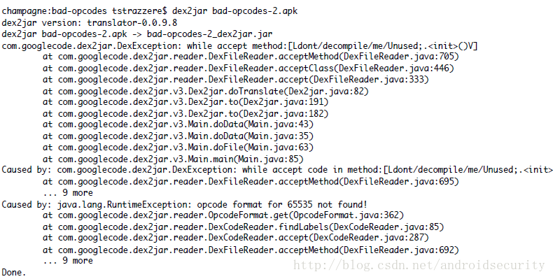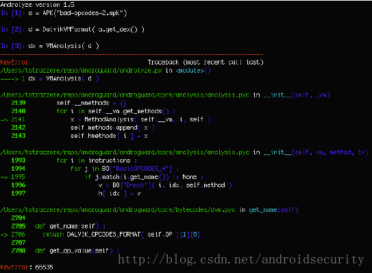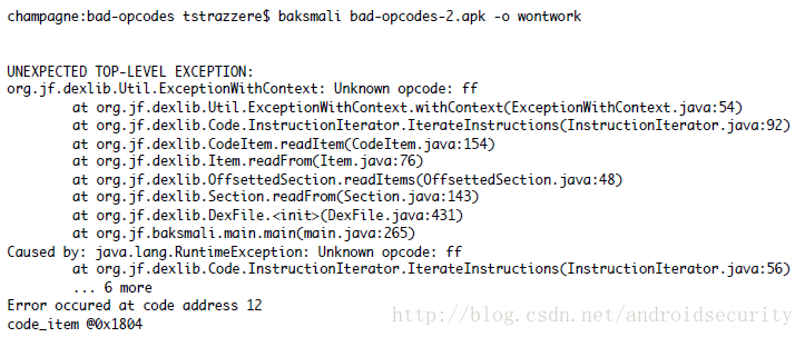 Androguard验证成功,但是只会在反编译插入该“有效字节码指令”的方法报错。