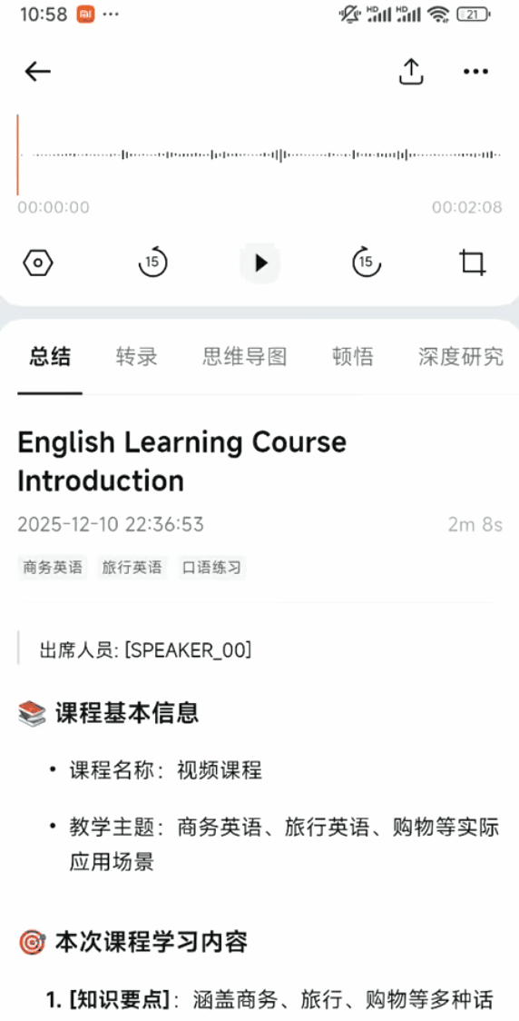 录音清晰度超出预期,即使在稍嘈杂的会议室,也能精准捕捉发言人声音,没有杂音干扰,后期转文字功能也很实用,识别准确率高,省去了手动整理笔记的大量时间。最惊喜的是AI总结和思维导图功能,能快速整理重点内容,大大提升工作效率!
