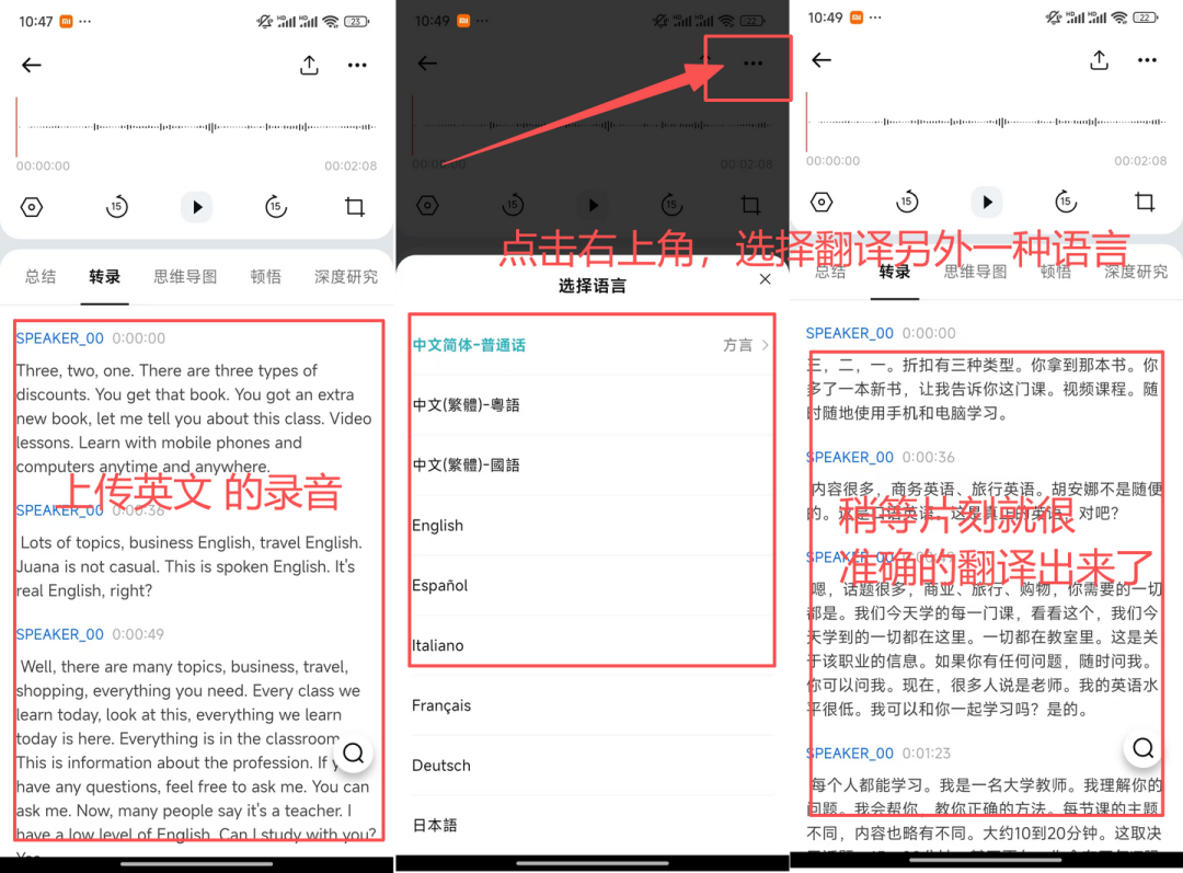 实时转录是我用过最多的一个场景。在实时转录过程中,可以支持多种语言的转写,让会议记录、跨境沟通、外语学习、出境旅行,一机搞定。