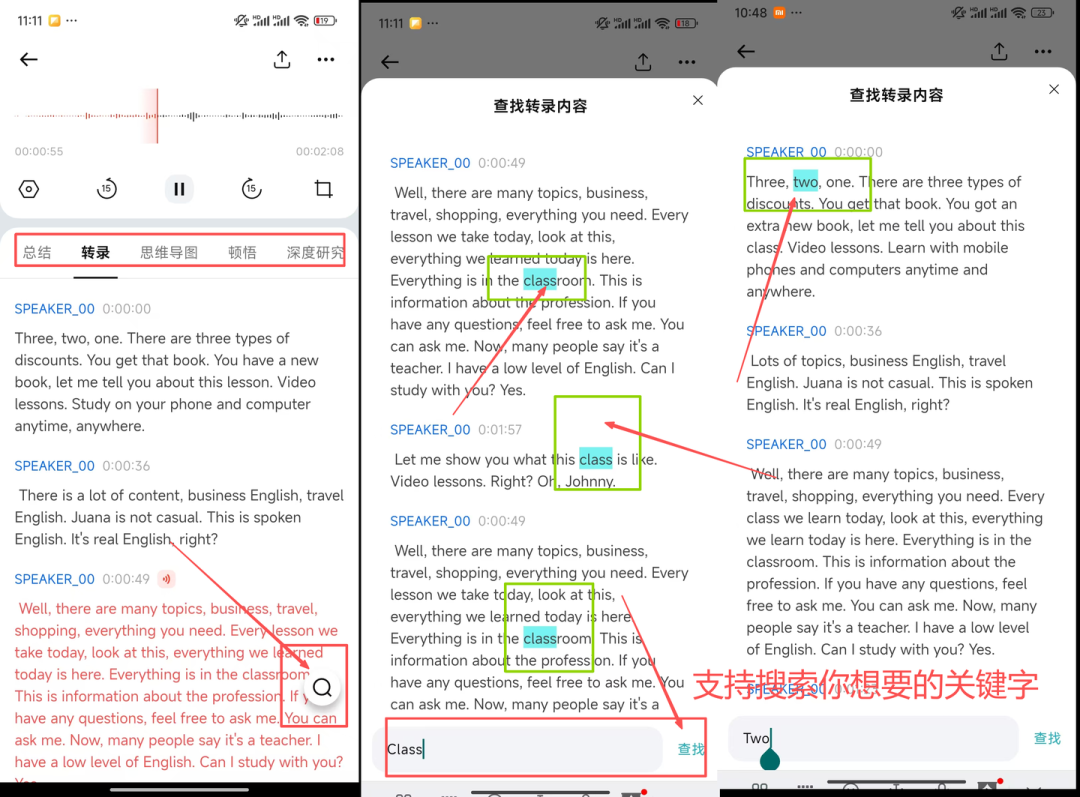 并且可以在转录的总结对其关键字进行搜索,一下子能找到自己想要的重点。