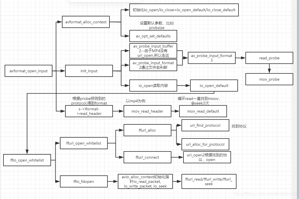 1)通过init_input打开流媒体数据,根据probe探测流媒体最合适的协议类型AVInputFormat,通过open2设置read/write/seek相关回调