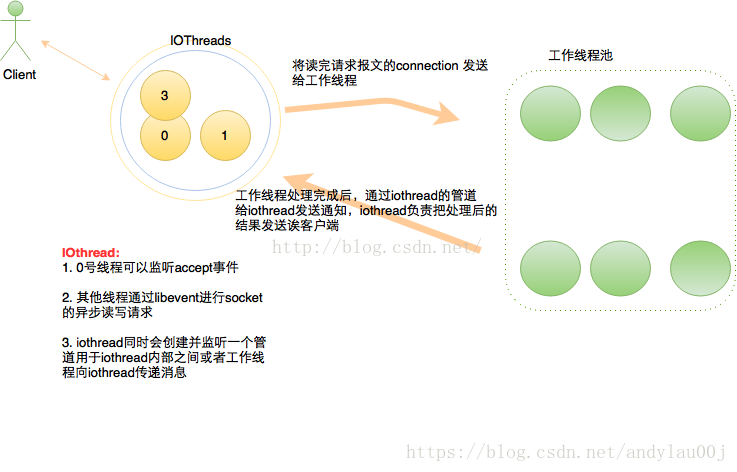 一言概之 IO线程 负责跟客户端 通讯,IO线程读取一个完整的请求后,任务封装成(class TNonblockingServer::TConnection::Task)投递给work线程,work线程读取解析数据,处理业务逻辑完成后,把结果notify给IO线程,后者负责返回结果给客户端。TNonblockingServer内 N个IO thread、N个work thread都不止一个。