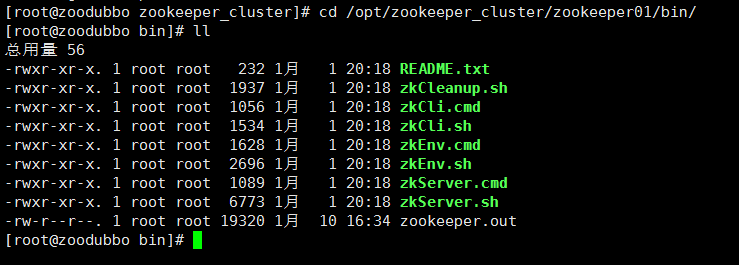 [root@zoodubbo zookeeper_cluster]# cd /opt/zookeeper_cluster/zookeeper01/bin/