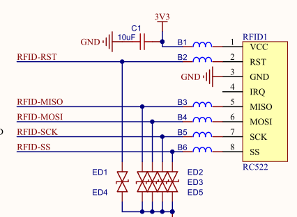 选用 RC522 RFID 读卡模块,支持 13.56MHz 频段的 MIFARE 1 S50 卡(校园一卡通常用类型),具备读卡速度快、功耗低、成本低的特点。模块采用 SPI 通信方式与 STM32 连接,SDA 引脚接 STM32 的 PB0,SCK 引脚接 PB1,MOSI 引脚接 PB2,MISO 引脚接 PB3,RST 引脚接 PB4,VCC 引脚接 3.3V 电源,GND 引脚接地。模块的天线部分采用小型化设计,嵌入座位终端,用户刷卡时,模块读取卡片的 UID 号,传输至单片机进行身份验证。