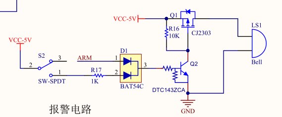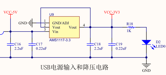 系统电源模块采用 USB 5V 输入,通过两路稳压电路分别输出 5V 和 3.3V 电压:一路通过 AMS1117-5.0 稳压芯片输出 5V,为红外人体感应模块、超声波模块、蜂鸣器模块、蓝牙模块供电;另一路通过 AMS1117-3.3 稳压芯片输出 3.3V,为 STM32 单片机、RFID 模块、OLED 模块供电。电源模块加入电源指示灯(接 PC3),显示供电状态;同时加入自恢复保险丝,防止过流损坏设备。
