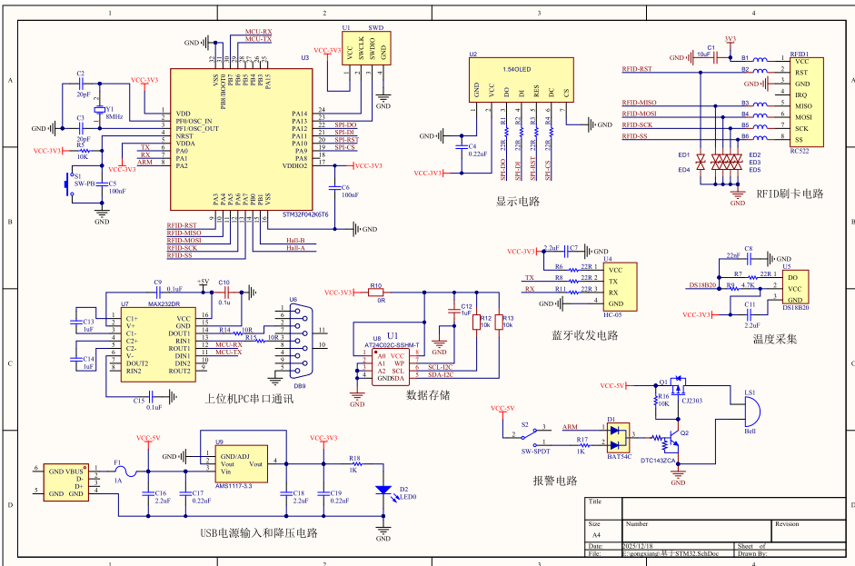 系统硬件电路以 STM32F103C8T6 最小系统为核心,外围扩展红外人体感应模块、超声波测距模块、RFID 读卡模块、OLED 显示模块、蓝牙通信模块、蜂鸣器报警模块、按键模块和电源模块。硬件设计遵循 “模块化、小型化、低功耗、高可靠性” 的原则,各模块通过 STM32 的 GPIO 口、USART 口、I2C 口等外设接口与核心控制器连接,实现数据采集、指令输入、状态显示和数据传输功能。