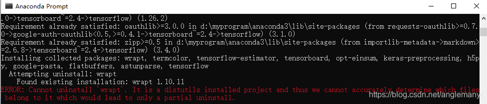 pip install tensorflow 报错:ERROR: Cannot uninstall 'wrapt'. It is a distutils installed project and thus we cannot accurately determine which files belong to it which would lead to only a partial uninstall.