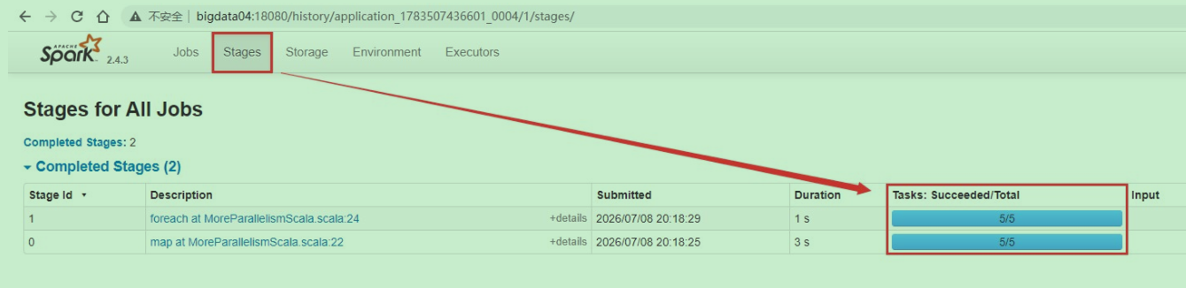 然后去看satges界面,两个Stage都是5个task并行执行,这5个task会使用5个cpu,但是我们给这个任务申请了10个cpu,所以就有5个是空闲的了。