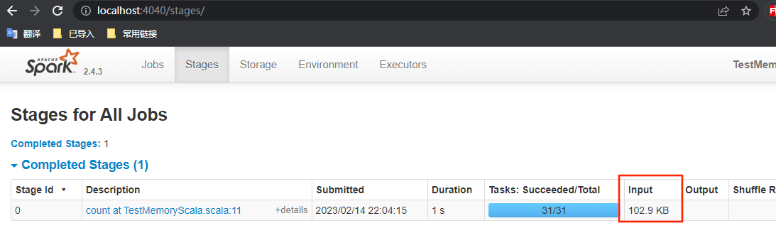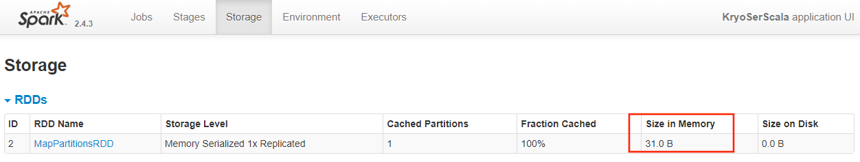 执行任务,然后访问localhost的4040界面。在界面中可以看到cache的数据大小是 31 字节