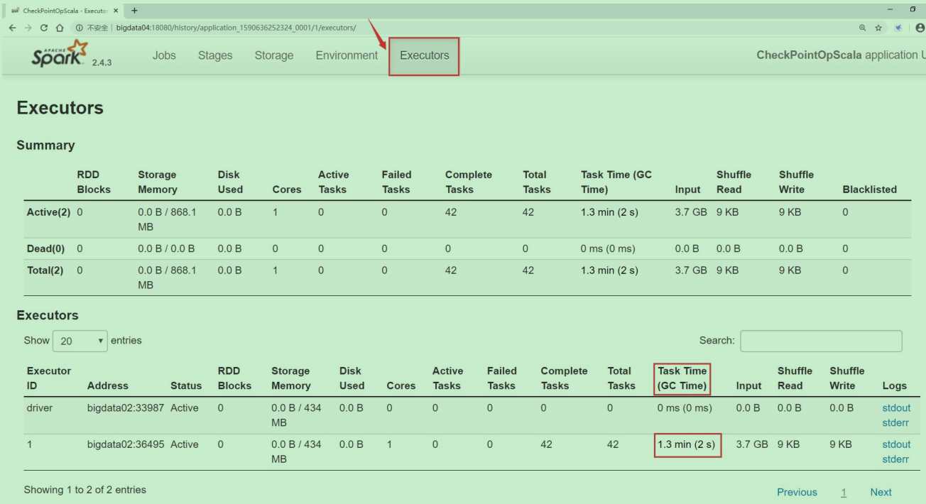 运行任务,再访问4040界面,发现此时的内存占用为 123 字节,介于前面的 31 字节和 140 字节之间。所以从这可以看出来,在使用kryo序列化的时候,针对自定义的类型最好是手工注册一下,否则就算开启了kryo序列化,性能的提升也是有限的。