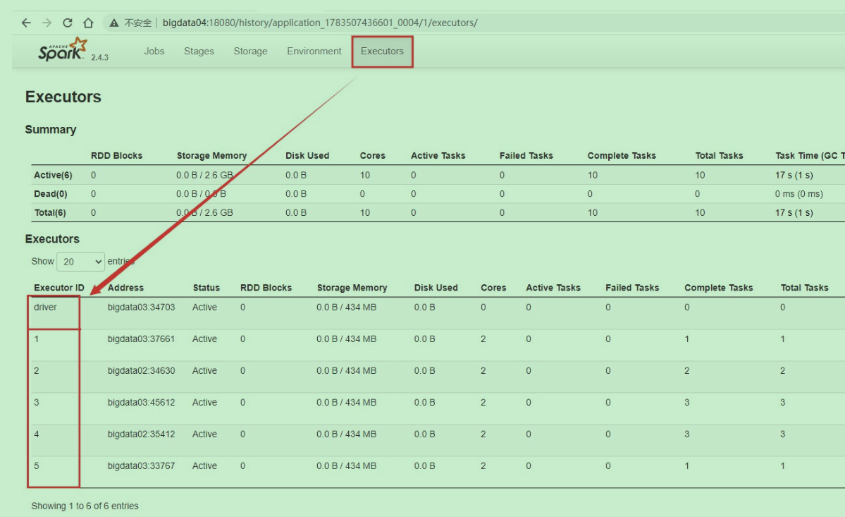 任务提交到集群运行之后,查看spark的任务界面,先看executors,这里显示了5个executor进程和1个driver进程