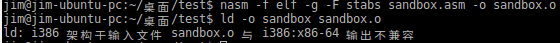 还有一点,使用ld时,有些书本上会这样写“ld -m elf_i386 -o sandbox.o sandbox”,现在新版本已经不支持了。